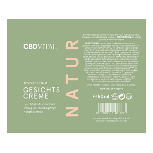 Die CBD Hydra Calm Creme von CBD VITAL ist eine regenerierende Anti-Aging-Pflege mit Cannabidiol und hochwertigen, ideal aufeinander abgestimmten Inhaltsstoffen, die laut Hersteller für mehr Elastizität und Festigkeit sowie für gestrafftere Gesichtskonturen und ein ebenmäßiges Hautbild sorgen. Der Hersteller empfiehlt, diese Creme mindestens 60 Tage anzuwenden und mit CBD Nahrungsergänzung zu kombinieren.